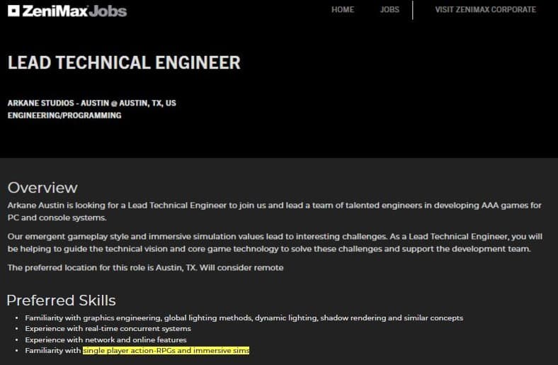 На официальном сайте компании появилось предложение о работе над новым крупнобюджетным проектом. Как гласит описание вакансии, старшему инженеру предстоит решать задачи, связанные с созданием симулятора погружения (immersive sim).Такое описание проекта вызывает ассоциации с серией Dishonored, которую многие считают главным достижением Arkane Austin. Более того, в качестве одного из желаемых качеств идеального кандидата называется знание однопользовательских боевых ролевых игр. Упоминание однопользовательской игры также исключает работу над продолжением Deathloop.
