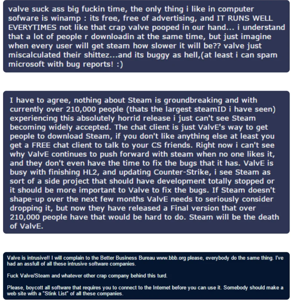 Steam не сразу строился и первые впечатления от сервиса были весьма своеобразными. Тогда в адрес Valve летели всевозможные оскорбления