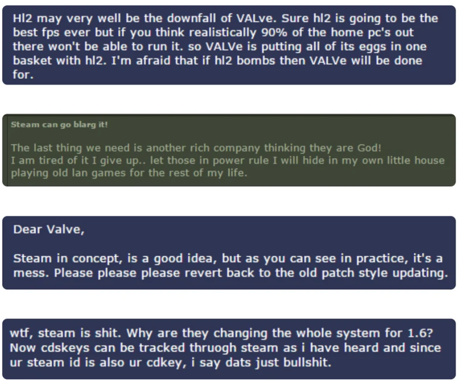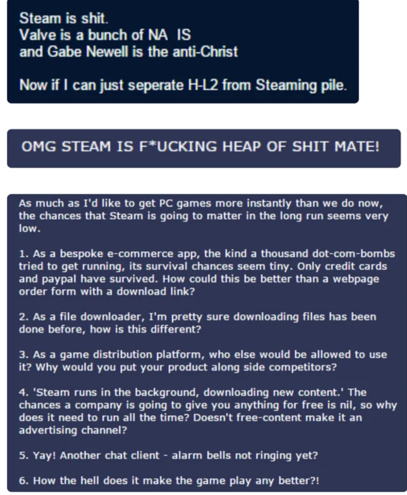 Сегодня многие игроки на ПК пользуются Steam, но когда-то в сервис не очень верили. FreeezingPancakes решил вспомнить о некоторых отзывах ранних пользователей Steam.