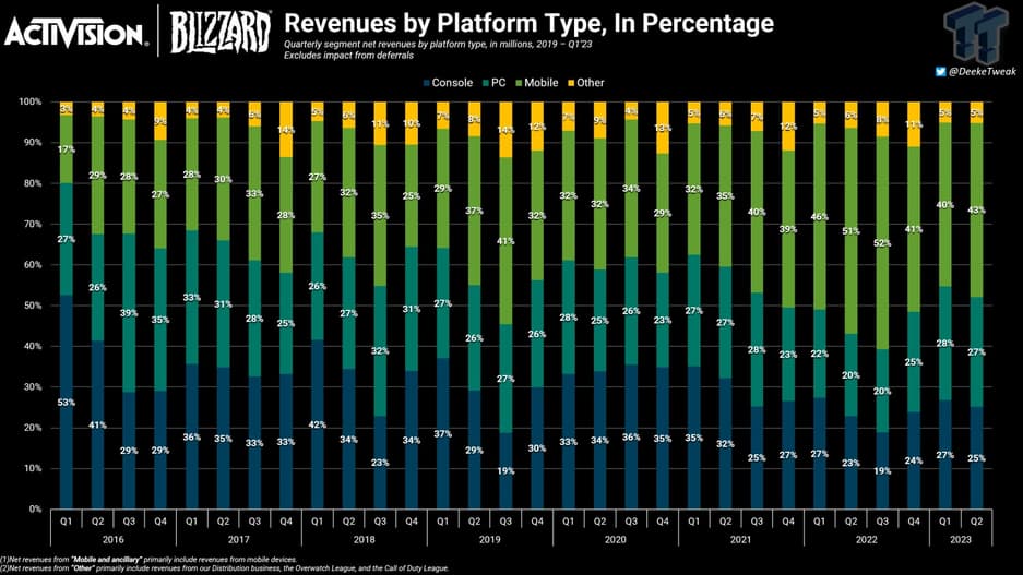 Последняя отчетность компании за 2 квартал 2023 года даёт возможность проследить, как мобильные игры повлияли на распределение доходов Activision по платформам. Результаты не менее интересны. Activision Blizzard King зарабатывает на мобильных устройствах более 900 миллионов долларов в течение четырех кварталов подряд за последний скользящий 12-месячный период.