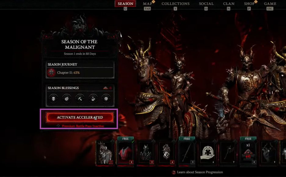 В Diablo 4 запустили первый сезон и ввели боевой пропуск. При этом кнопка активации премиальной версии пропуска расположена весьма хитро — она рядом со вкладкой, где проверяют сезонный прогресс.