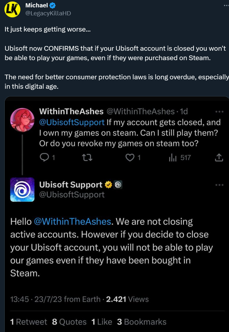 Тем временем пользователи обратили внимание на другой ответ Ubisoft. Представитель поддержки подтвердил, что если блокируют (закрывают по желанию пользователя) аккаунт Ubisoft, то не получится поиграть в игры компании купленные в Steam.