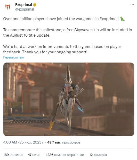Capcom в Twitter недавно объявила, что менее чем за две недели после запуска Exoprimal превысила миллион игроков по всему миру на всех платформах. Цифра не отражает продаж, особенно если учесть доступность в Game Pass, но, похоже, старт для нового бренда получился получился удачным.