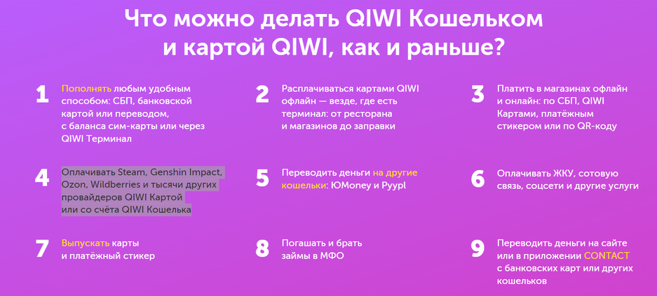 - Снятие наличных в банкоматах и QIWI Кассах