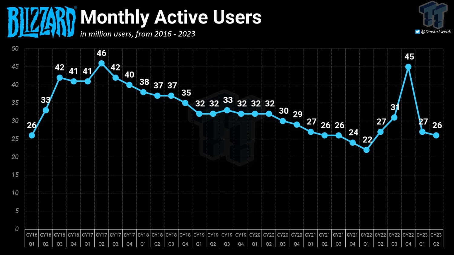 В своем недавнем отчете о прибылях за II квартал 2023 года Activision Blizzard King указала общее количество активных игроков за апрель-июнь. За это время количество ежемесячных активных пользователей (MAU) Blizzard сократилось на 1 млн игроков, в результате чего общее количество MAU составило 26 млн человек. Это могло произойти по нескольким причинам.