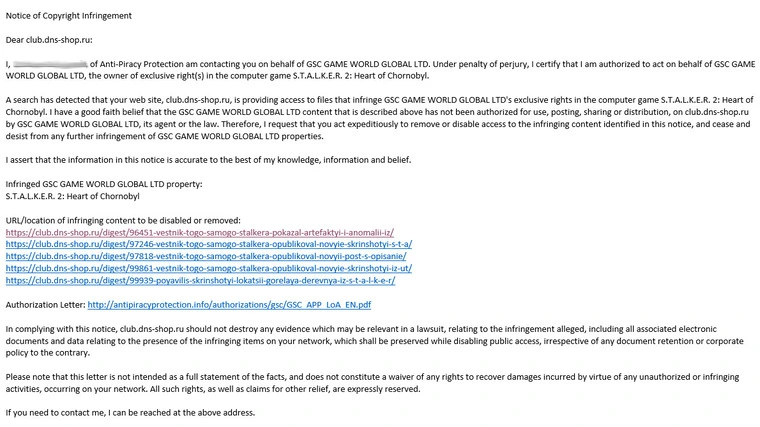 Обращают внимание на особенность письма: «Отправитель требует, чтобы портал в обязательном порядке сохранил все доказательства того, что ущемляющие авторские права материалы по игре S.T.A.L.K.E.R. 2: Heart of Chornobyl действительно были опубликованы, чтобы они потом могли оперировать этими данными в суде. Кроме того, они заявляют, что все равно собираются судиться с порталами и возмещать убытки от якобы нанесенного ущерба независимо от исполнения предписания».