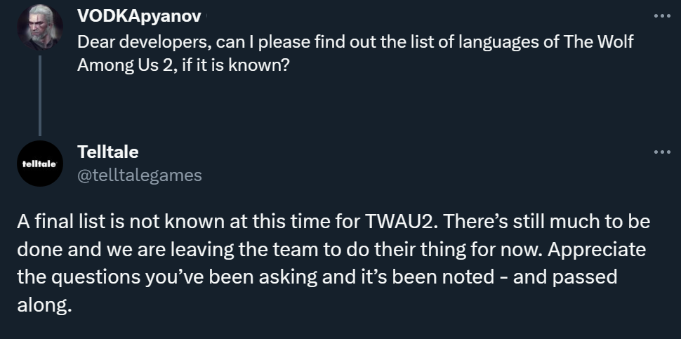 Оказалось, что сама Telltale сейчас не очень представляет, на какие языки переведут The Wolf Among Us 2: