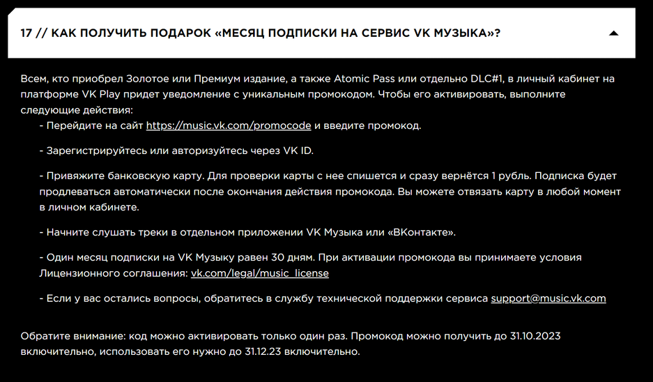 Судя по FAQ, за Золотое или Премиум издание игры Mundfish тоже подарят месяц подписки VK Музыка. Код можно получить лишь один раз до 31.10.2023, а активировать надо до 31.12.23 включительно.