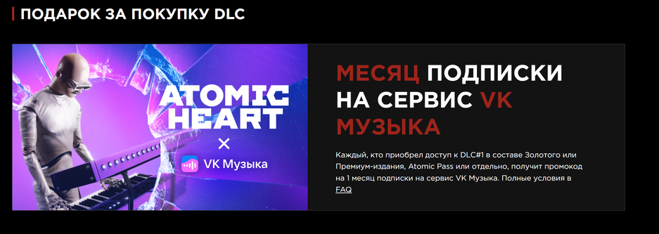 Покупателям Annihilation Instinct для Atomic Heart в VK Play обещают подарок: 1 месяц подписки на сервис VK Музыка. Как его активировать — можно прочитать в 17 пункте FAQ вот здесь.