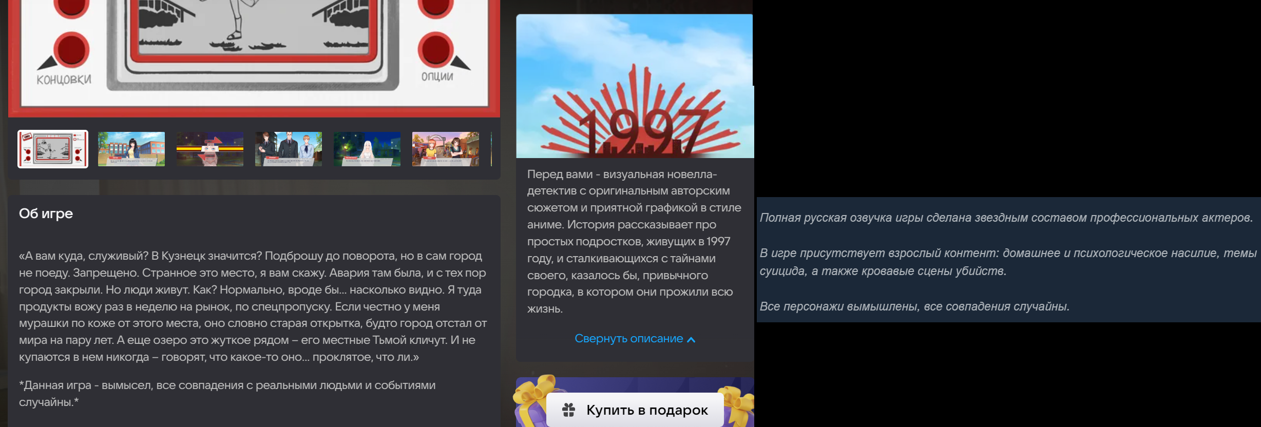 Есть интересный момент. В описании «1997» в Steam оставили предупреждение: «В игре присутствует взрослый контент: домашнее и психологическое насилие, темы суицида, а также кровавые сцены убийств». В VK Play данную информацию найти не удалось.