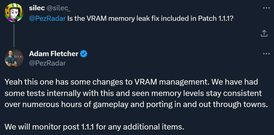 Представитель Blizzard заявил, что в обновлении 1.1.1 для Diablo 4 есть «некоторые изменения в управлении видеопамятью» (у некоторых ещё есть проблемы с оперативной памятью). Судя по внутренним тестам, уровень видеопамяти остаётся прежним в течение многих часов и телепортации в города и обратно.