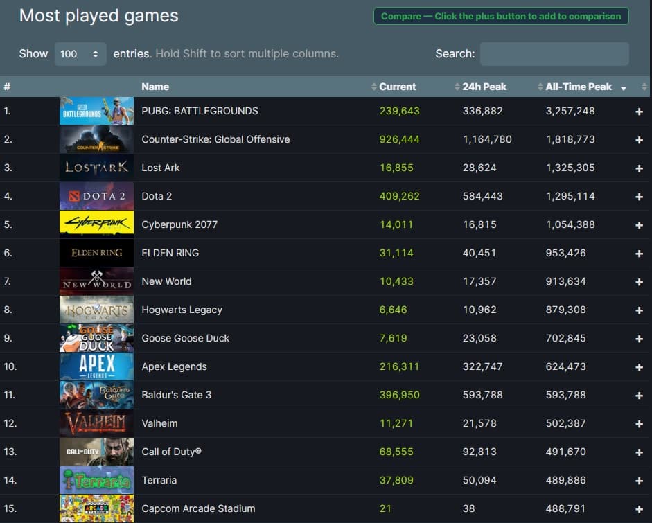 Baldur's Gate 3 официально занимает 11-е место по популярности среди игр с самым высоким онлайном в Steam. Но ей далеко до результатов PUBG: BATTLEGROUNDS (3 257 248), Counter-Strike: Global Offensive (1 818 773) и Lost Ark (1 325 305).