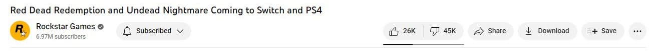 На YouTube комментаторы тоже выражают «особую любовь» к Rockstar: у трейлера свыше 45 тысяч пальцев вниз при 26 тысячах пальцах вверх.