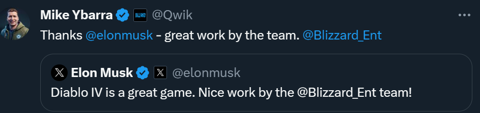 Первые две Diablo ему очень нравятся, а вот третью часть он не любит. Diablo 4 Илон назвал отличной игрой, на это отреагировал президент Blizzard Entertainment Майк Ибарра (Mike Ybarra) и поблагодарил.