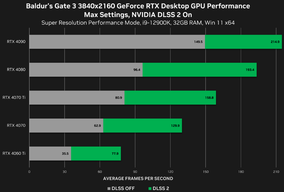 NVIDIA приводит сравнение производительности Baldur's Gate 3 для видеокарт RTX 40 серии без DLSS 2 и при использовании технологии (3840х2160 и максимальные настройки графики). В ходе тестов установили, что в среднем повышение производительности составило 93%.
