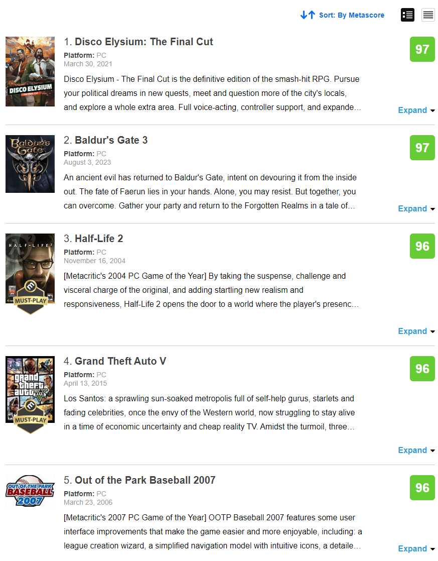 Примечательно, что у Disco Elysium The Final Cut и Baldur's Gate 3 по 97 баллов, т.е. технически игры делят (или сражаются на равных за) первое место.