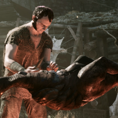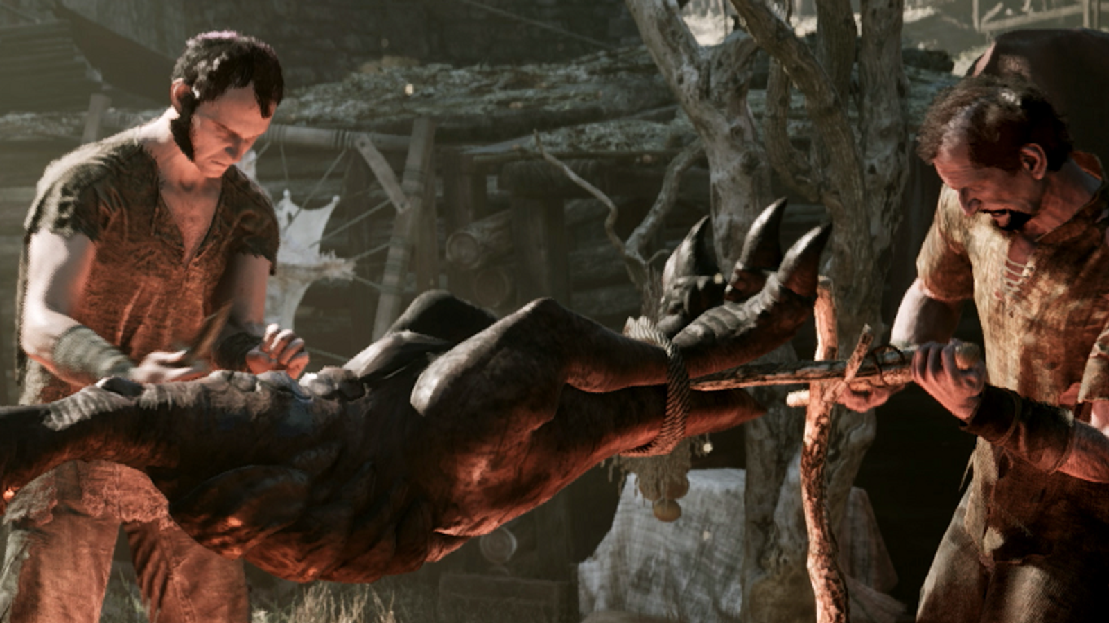 В кадр попала группа жителей, которые занимаются приготовлением пищи (на вертеле в этот раз оказался Падальщик, птица).