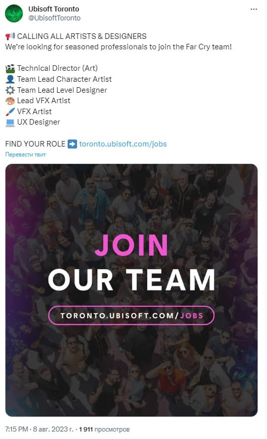 В сообщении на Twitter/X говорится, что новые сотрудники присоединятся к команде, отвечающей за бренд Far Cry (несколько предложений относятся и к Splinter Cell). В основном требуются художники, дизайнеры интерфейсов и уровней, а также технический директор, что говорит о ранней стадии разработки.