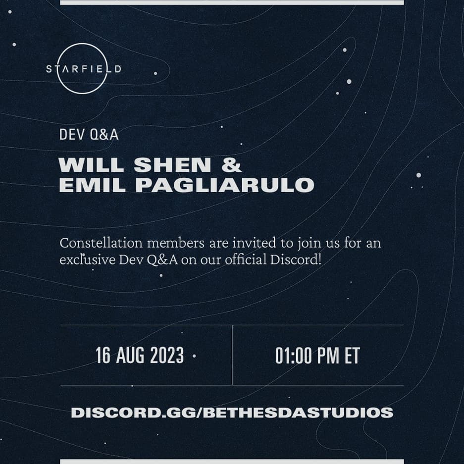 Во время сессии вопросов и ответов можно задать вопросы Уиллу Шену и Эмилю Пальяруло, которые отвечают за разработку и написание сценария Starfield. Вопросы должны быть размещены до 11 августа на канале #constellation-questions в Discord. Неизвестно, сколько и какие вопросы будут отобраны.
