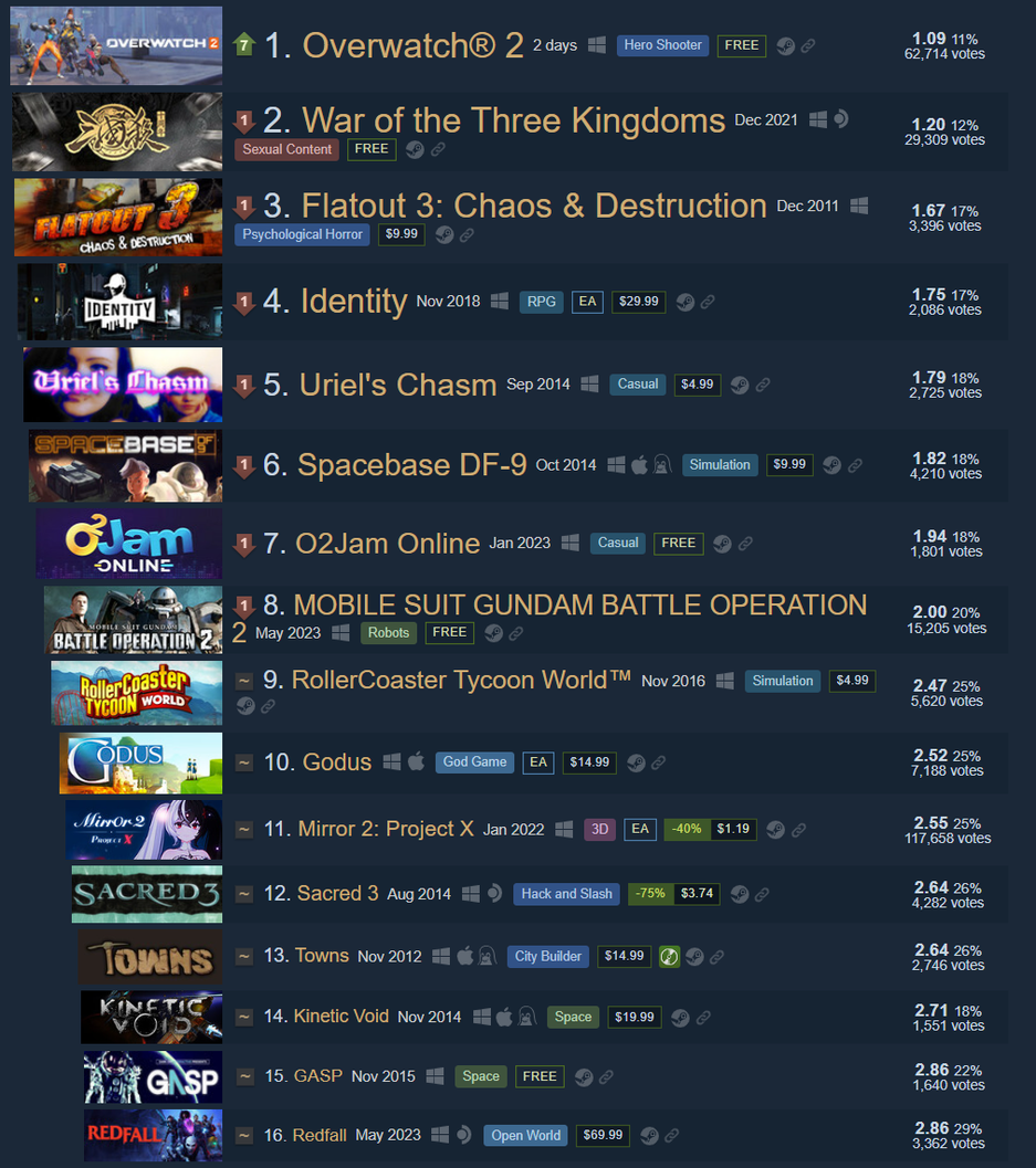Теперь Overwatch 2 возглавляет топ худших игр в истории Steam, War of the Three Kingdoms на втором, а Flatout 3 Chaos & Destruction на третьем месте.