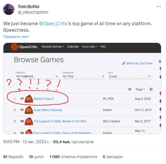Том Батлер, старший менеджер по продуктам Larian Studios, опубликовал показательный график – Baldur's Gate 3 стала самой высокорейтинговой игрой в истории сайта OpenCritic.
