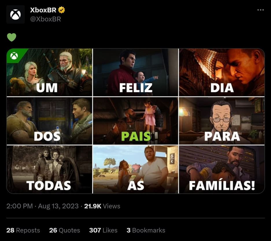 Пользователи Интернета заметили, что бразильское отделение Xbox опубликовало изображение, посвященное Дню отца (праздник отмечается в Бразилии во второе воскресенье августа), на котором есть пожелания и кадры из нескольких игр. Кроме кадров из The Witcher 3, Gears и The Walking Dead опубликован снимок, на котором изображены Баррет и Марлен из Final Fantasy 7 Remake. Игра Square Enix – единственная из упомянутых, которая недоступна на консолях Microsoft.