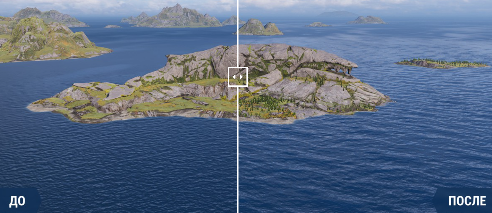 Графику «Мира кораблей» решили основательно улучшить, например высокодетализированные текстуры добавляют в Порт «Нью-Йорк», на карты «Новый рассвет», «К полюсу!» и «Острова». Для этих карт обновят модель коллизии островов, теперь она совпадает с контурами в игре (это должно снизить число инцидентов, когда корабли у острова могли «застрять»).