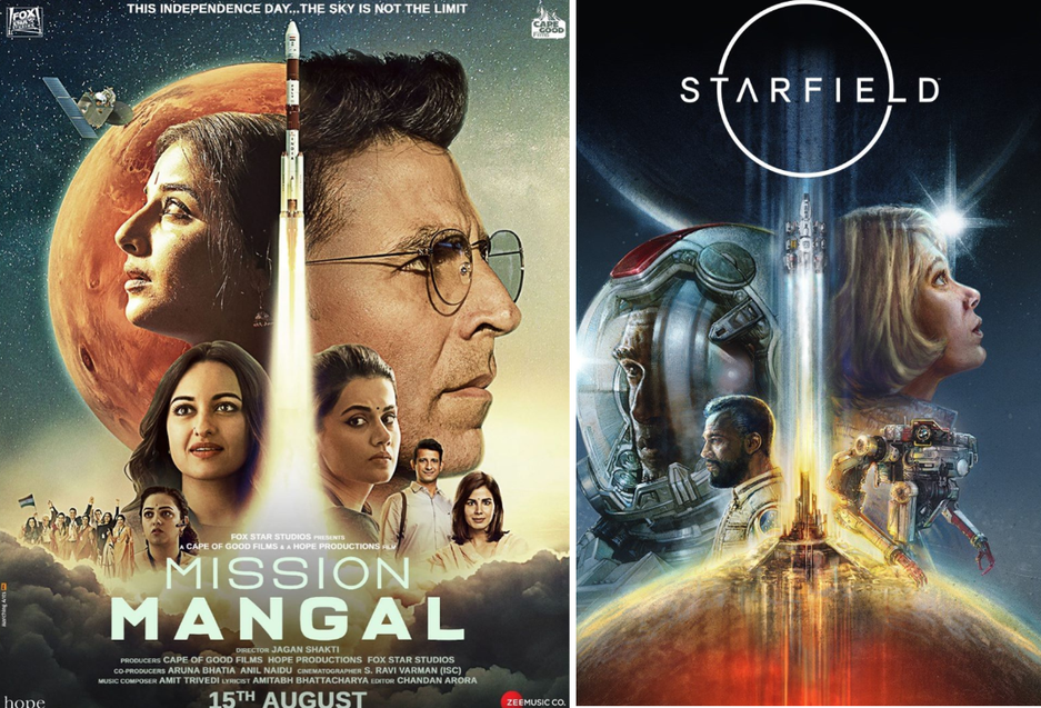 При прямом сравнении постера Starfield и фильма Mission Mangal (2019) действительно просматривается определённое сходство: взлетает космический корабль и его след разделяет группу персонажей.