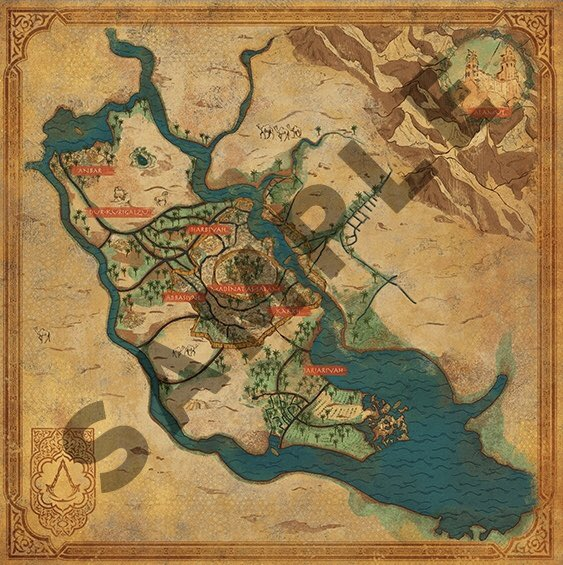 Есть изображение-образец, карта мира Assassin's Creed Mirage представлена в низком разрешении, т.е. пока не удастся изучить мельчайшие детали. Тем не менее она позволяет получить общее представление о структуре мира: Багдад и окрестности.