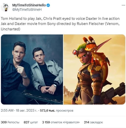 По его словам, в разработке находится экранизация игры Jak and Daxter, в которой Том Холланд сыграет Джека, а Крис Пратт озвучит Дакстера. Режиссёром якобы выступит Рубен Флейшер (Venom, Uncharted).