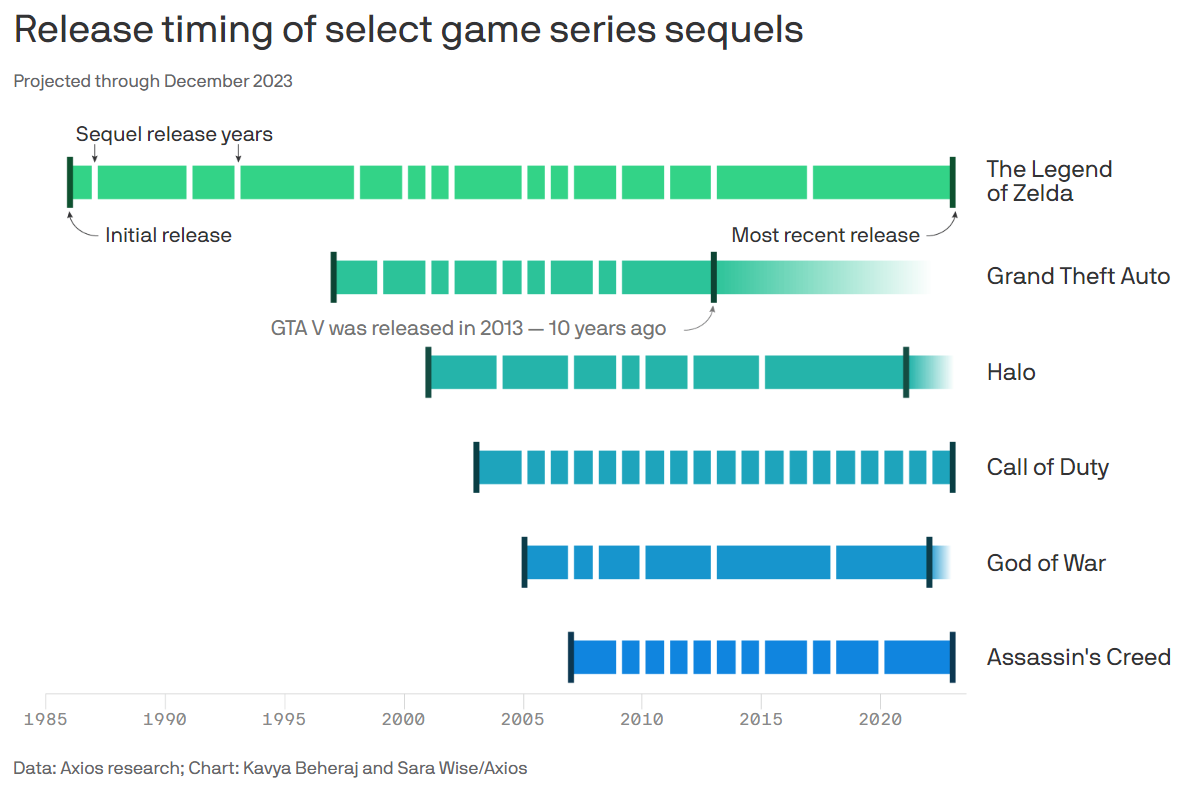 В поле зрения Axios попали: The Legend of Zelda, Grand Theft Auto, Halo, Call of Duty, God of War, Assassin's Creed. Получился следующий график.