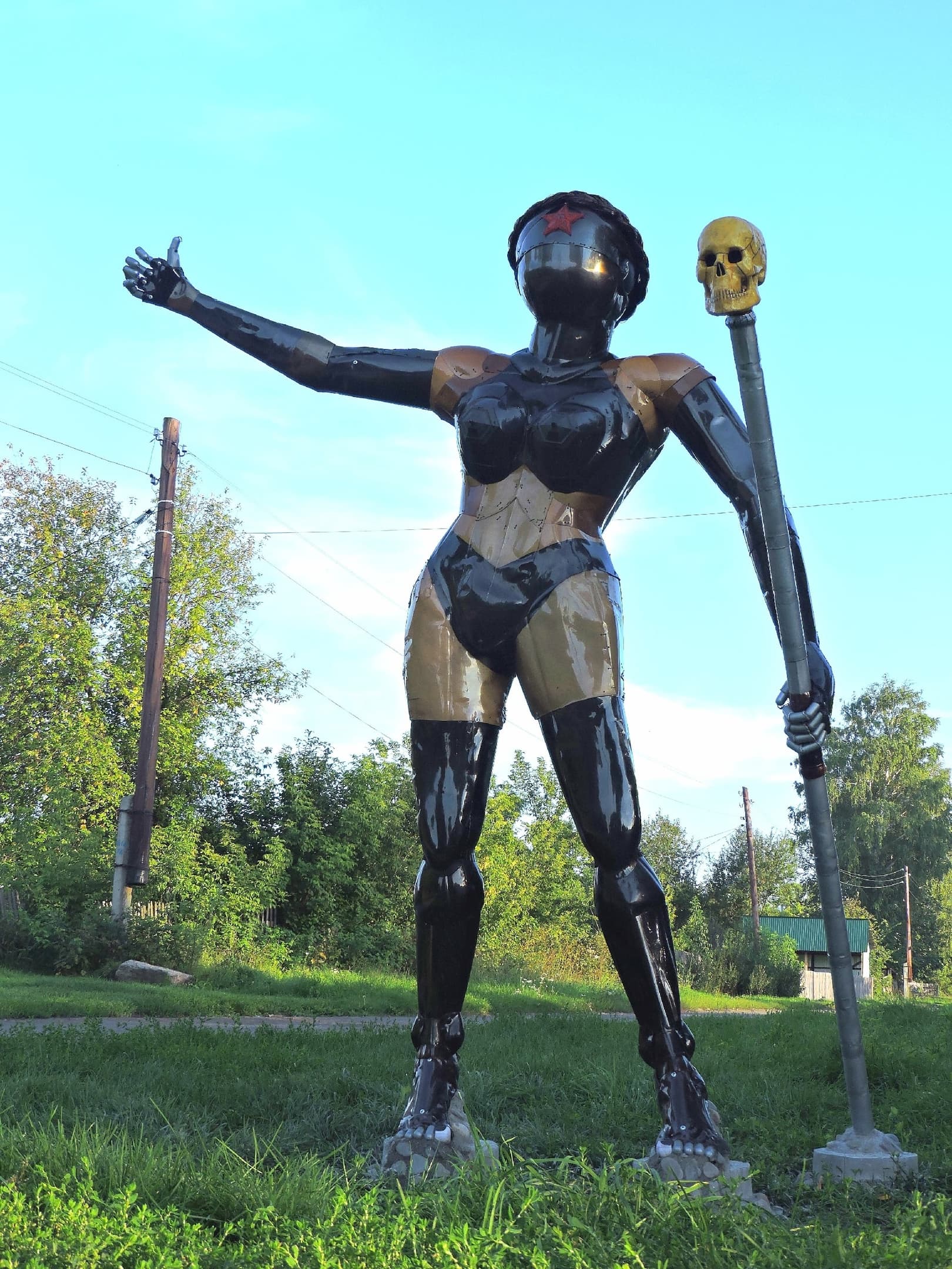 «...Такие как автомобильные бампера, обломки стиральных машин, пылесосов, пластиковых столов, канализационные трубы. Навесив всю эту ересь на металлический каркас, обтянул всё это "мясо" опять же чудесным полимером из которого состоят пивные кеги и всем знакомые "полторашки". А с помощью недавно показанного мною прибора по добыванию ПЭТ-ленты из тех же "полторашек" я получил достаточное количество волос, чтобы сплести косу, которая является на мой взгляд главной отличительной чертой, узнаваемой фишкой, и вообще "вишенкой на торте" во всем образе Близняшек. Череп для посоха я нашёл в мусорном контейнере. Шёл в магазин, а он на меня глядит из контейнера. Взял его с собой. Как оказалось, это старый гипсовый учебный экспонат из школьного кабинета Биологии. Череп был значительно повреждён, и пришлось его реставрировать».