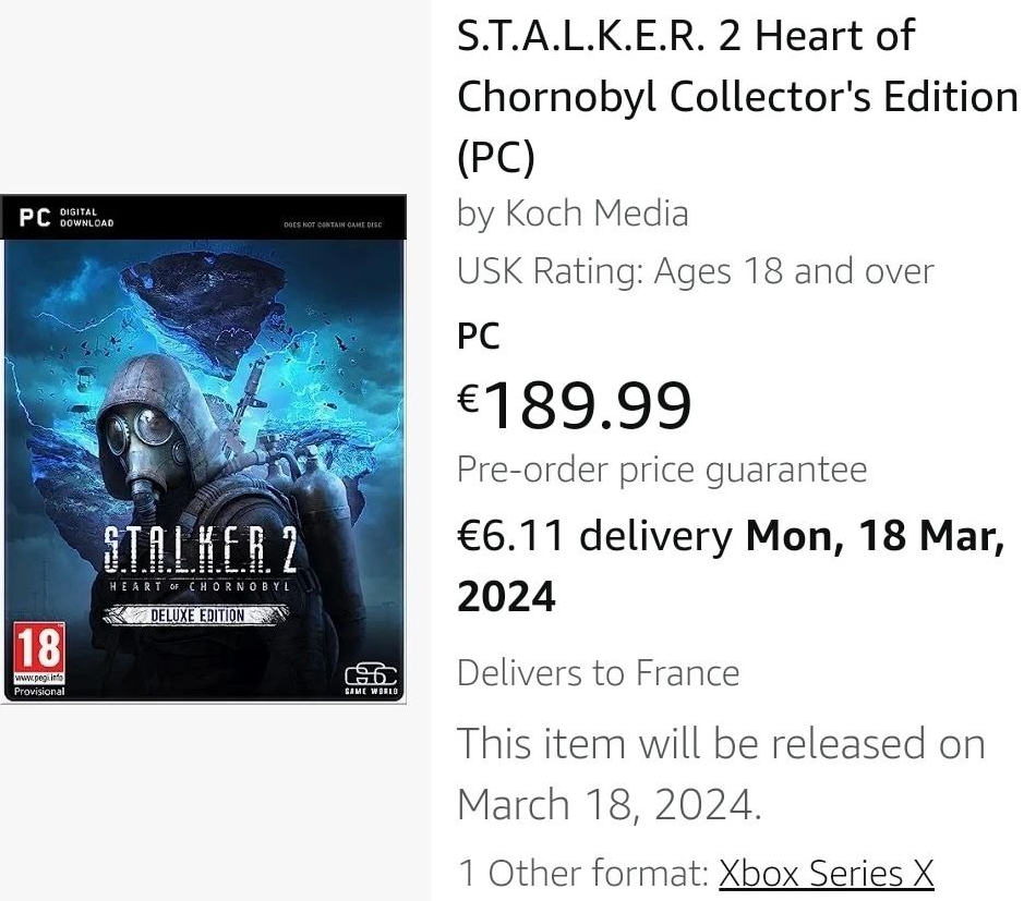 Теперь же пользователи заметили, что у S.T.A.L.K.E.R. 2 Heart of Chornobyl на Amazon в качестве даты релиза стоит 18 марта 2024 года.