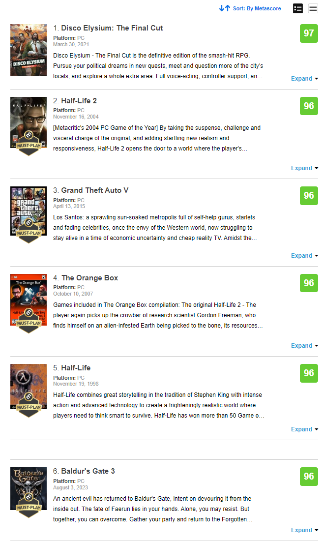 Однако Baldur’s Gate 3 снесли с первого места Metacritic, до недавнего момента она была лучшей игрой для ПК в истории.