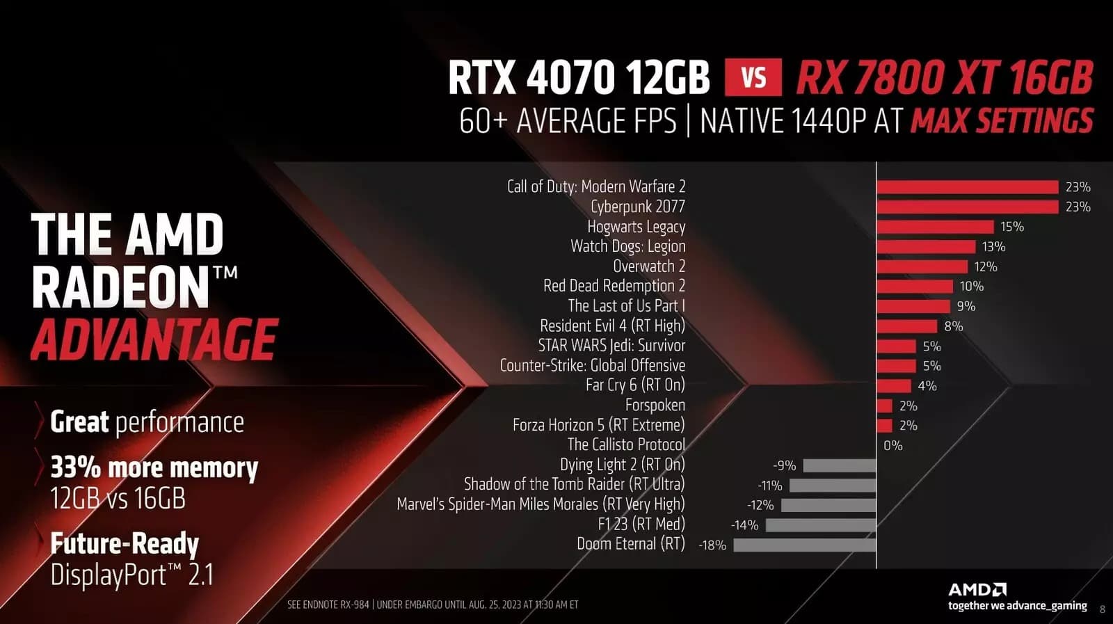 Внешне новые видеокарты напоминают флагманскую RX 7900, при этом цена RX 7700 XT составляет 449 долларов, а RX 7800 XT - 499 долларов. Эти графические процессоры призваны стать ответом на NVIDIA GeForce RTX 4060 Ti и RTX 4070. Графические процессоры от AMD, согласно представленным слайдам, демонстрируют более высокую производительность в подавляющем большинстве новых игр, а также обладают рядом других технологий. Компания приводит сравнение с более старыми GPU, а именно с семейством RTX 20 и моделями серии Radeon 5000. На слайдах ниже представлены все новые возможности.