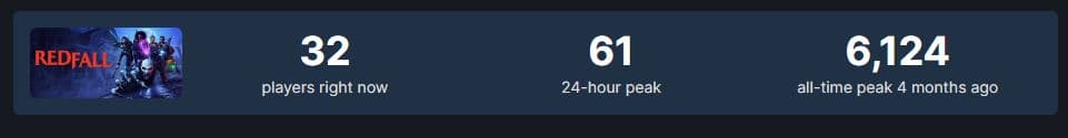 Пиковый онлайн Redfall в Steam рухнул на 99% c 6 100 активных игроков до 61. Сейчас на вампиров и вовсе охотятся 32 человека.