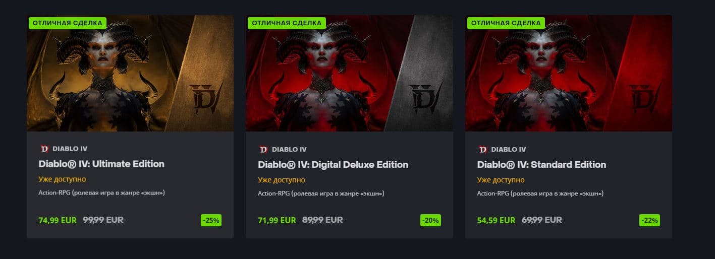До 4 сентября Diablo 4 можно будет забрать по скидке от 20 до 25% в зависимости от выбранного издания. Стоит напомнить, что с момента релиза ролевого экшена прошло меньше трех месяцев, когда Blizzard не так часто предлагает свои игры по скидкам так быстро.