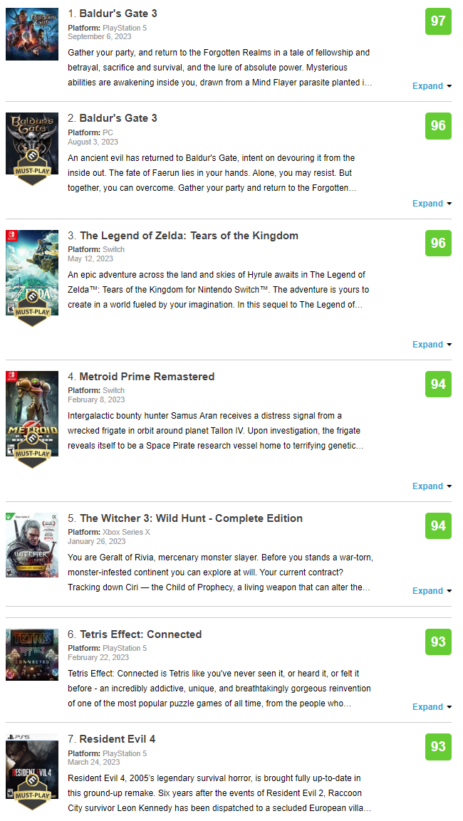 Сейчас в топе Metacritic за 2023 год сразу две Baldur's Gate 3: на первом месте PS5-версия с 97 баллами, а на втором ПК-версия с 96 баллами.