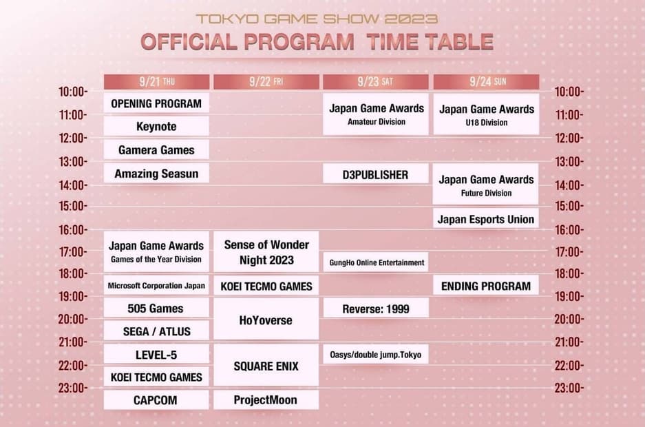 Ниже приведено почасовое расписание (время японское - +6 часов к московскому) основных событий TGS 2023, которая пройдёт с 21 по 24 сентября. Почти все мероприятия будут транслироваться в прямом эфире.