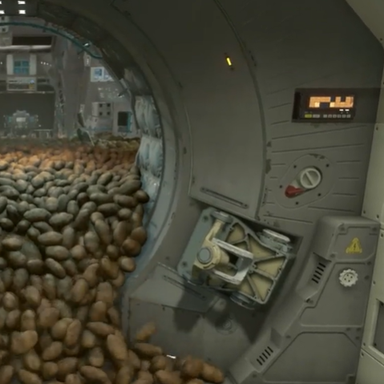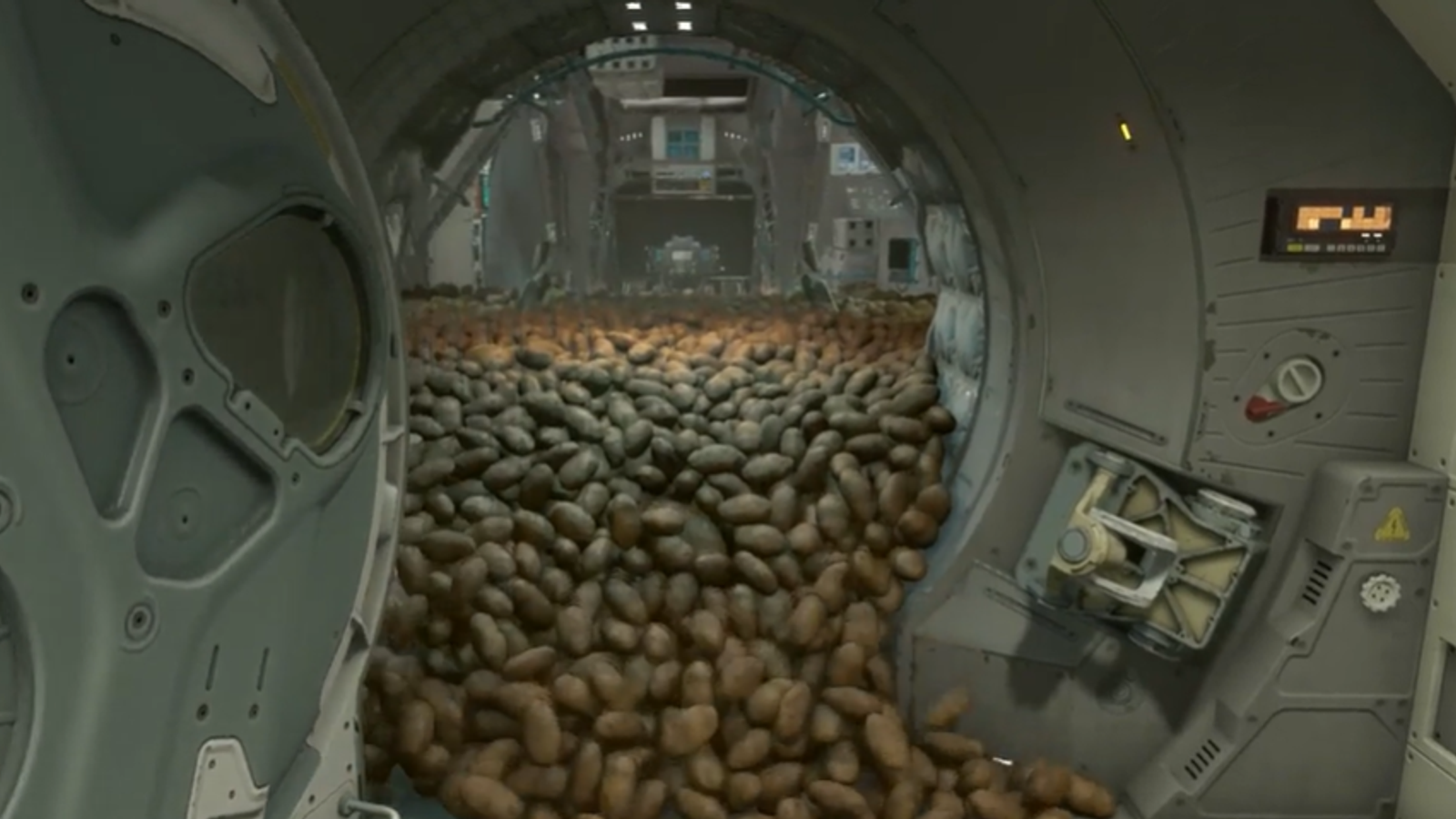 Moozipan засыпал картошкой помещение космического корабля, а затем открыл люк — картошка начала рассыпаться по полу. Закрытие люка повлияло на картошку, она начала довольно реалистично сдвигаться в стороны.