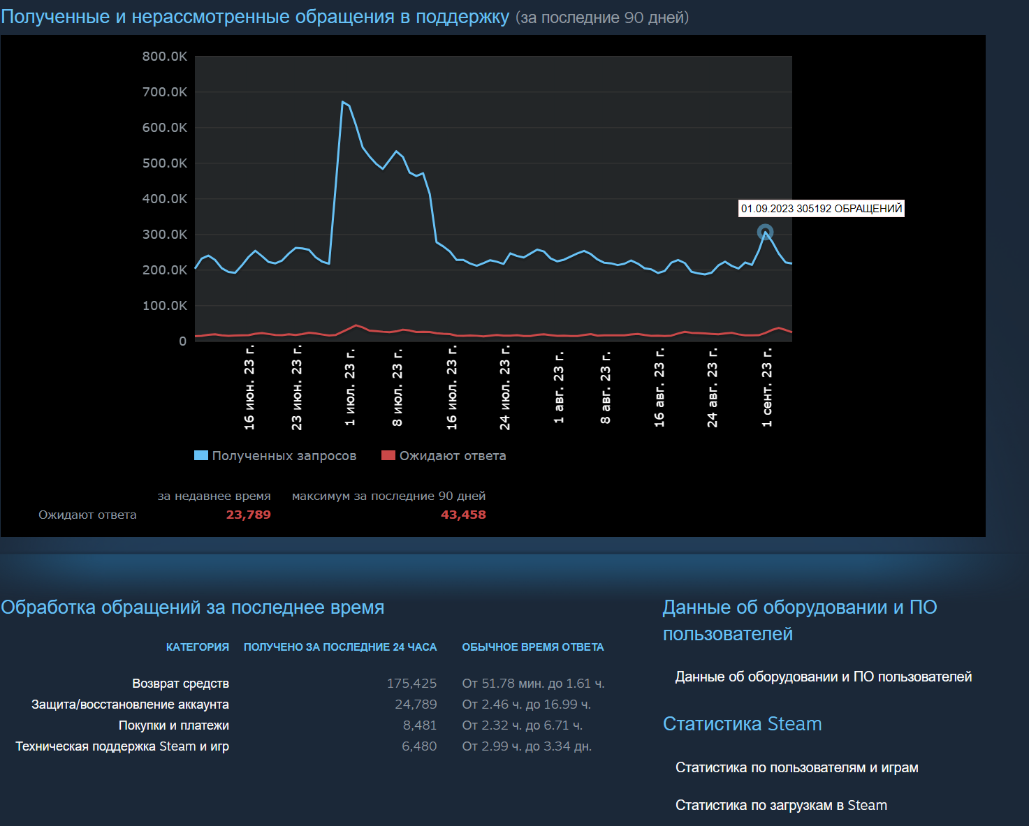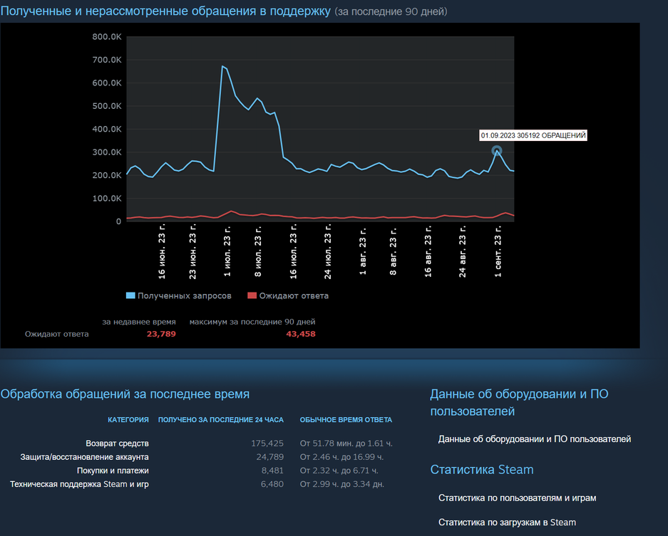 Тем не менее на графике можно заметить интересный всплеск числа обращений. Он приходится на 1 сентября, ранний доступ Starfield открыли в этот день. Обычно большинство обращений — о возврате средств.