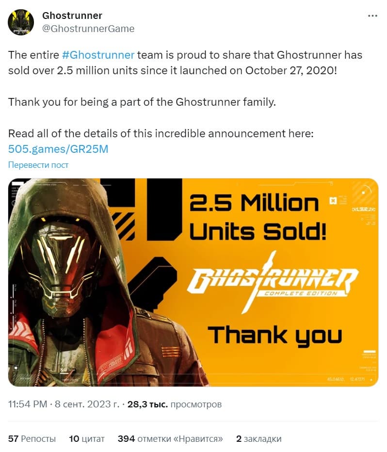 Студия сообщила, что Ghostrunner продана 2,5 миллионами копий. Разработчики хотели объявить о достижении двухмиллионного рубежа, но были так заняты Ghostrunner 2, что слегка опоздали. Такими темпами скоро будет достигнул рубеж в 3 миллионов.