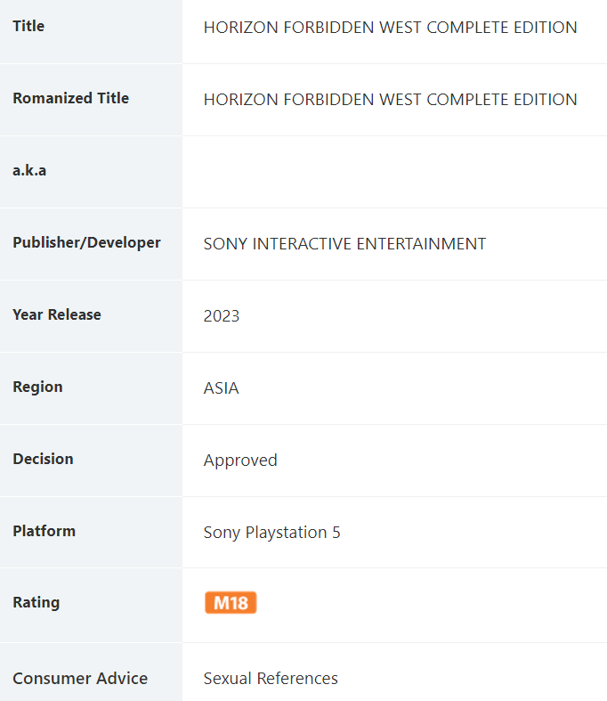 Некой Horizon Forbidden West Complete Edition для PlayStation 5 присудили M18. HFW представлена и на PS4, в базе упоминается лишь PS5-версия издания.