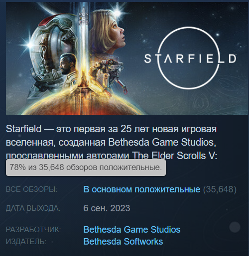 У Starfield в Steam теперь в основном положительные отзывы, 78% положительных из 35648 штук. В недавних отзывах часто мелькает тема технического состояния новинки Bethesda. Кто-то припоминает слова Тодда Говарда.