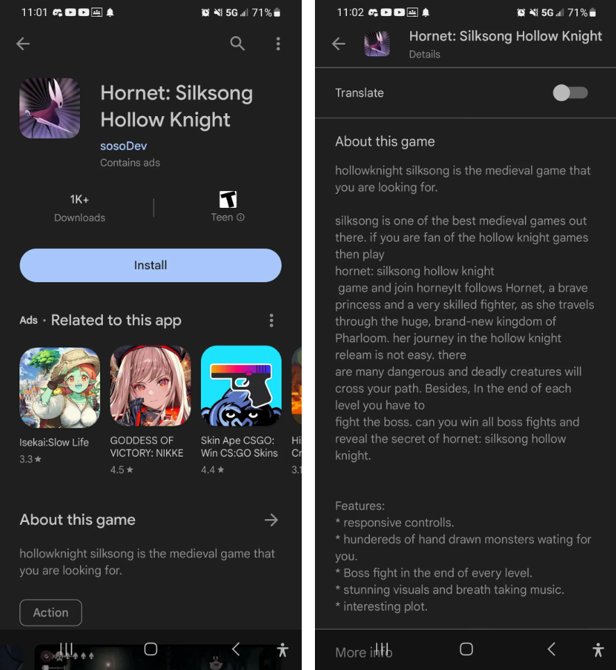 Скриншоты обнадёживали (ведь это кадры Hollow Knight Silksong), но быстро выяснилось, что это обыкновенная игра-подделка, которая толком не работает.