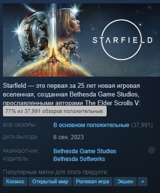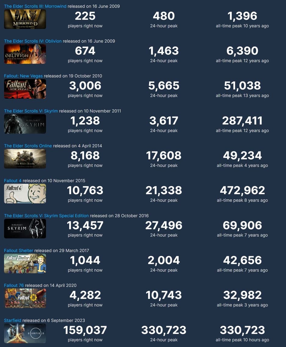 Вчера Starfield преодолела отметку в 330 тысяч одновременных пользователей в Steam, и хотя этот результат лучше, чем у Skyrim, стоит отметить, что до Fallout 4, собравшей в своё время на 100 000 человек больше, ещё далеко.
