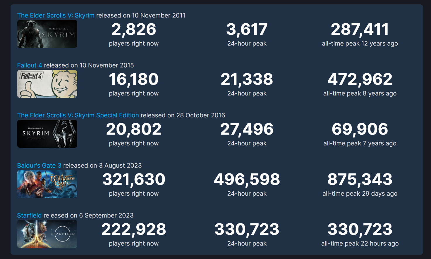 Если легендарная The Elder Scrolls V Skyrim пала под натиском онлайна Starfield, то вот Fallout 4 (472 962 игроков) и Baldur's Gate 3 (875 343) пока держатся.