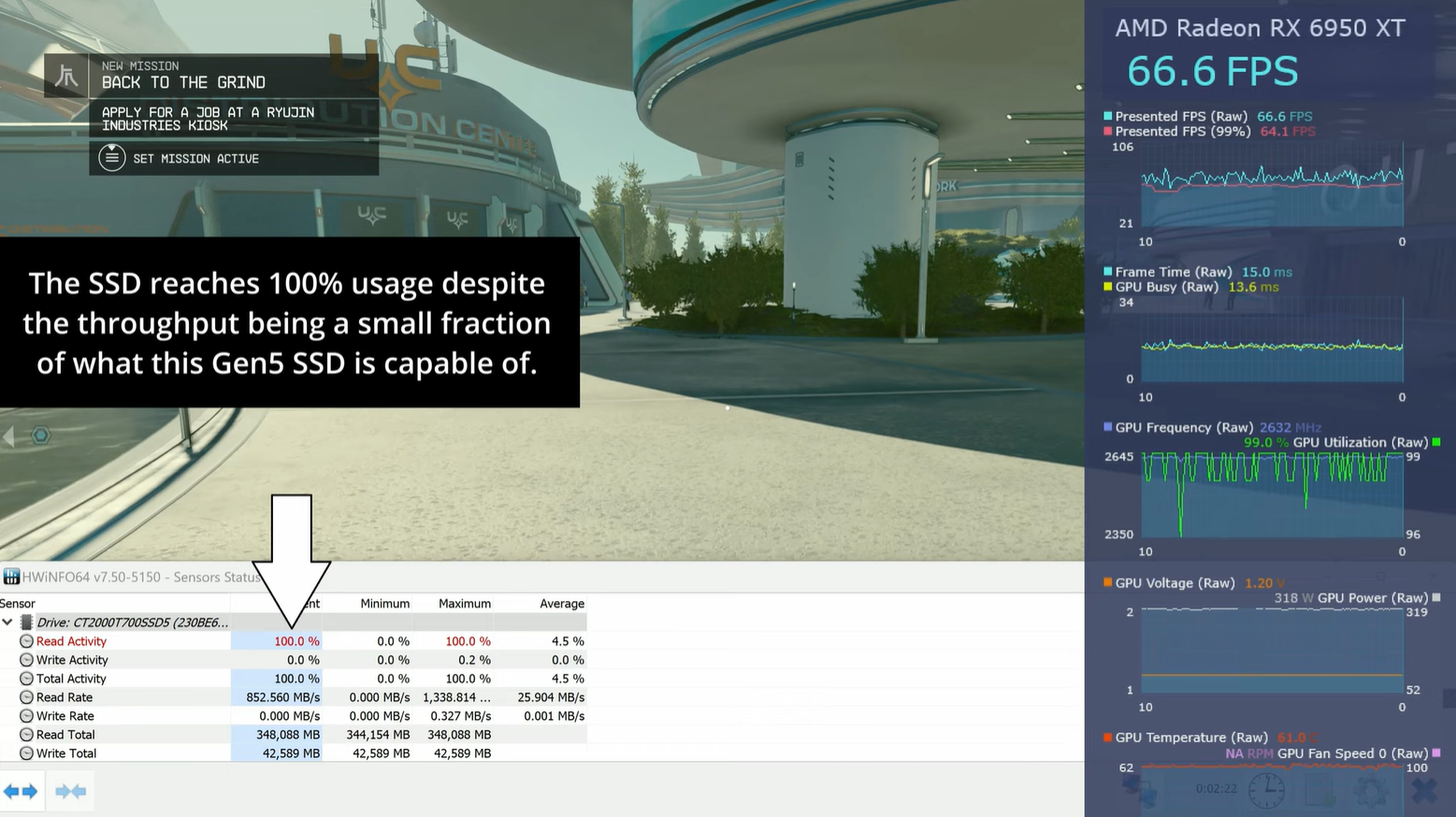 На Compusemble показали, что PCIe Gen5 SSD не обезопасит от статтеринга («заикания игры»). В некоторые моменты можно увидеть загрузку на 100% при этом Read Rate чуть больше 850 МБ / сек. Высокая нагрузка наблюдается даже на низких настройках. Для сравнения: у Ratchet & Clank Rift Apart при загрузке ~40-45% Read Rate в несколько раз больше.