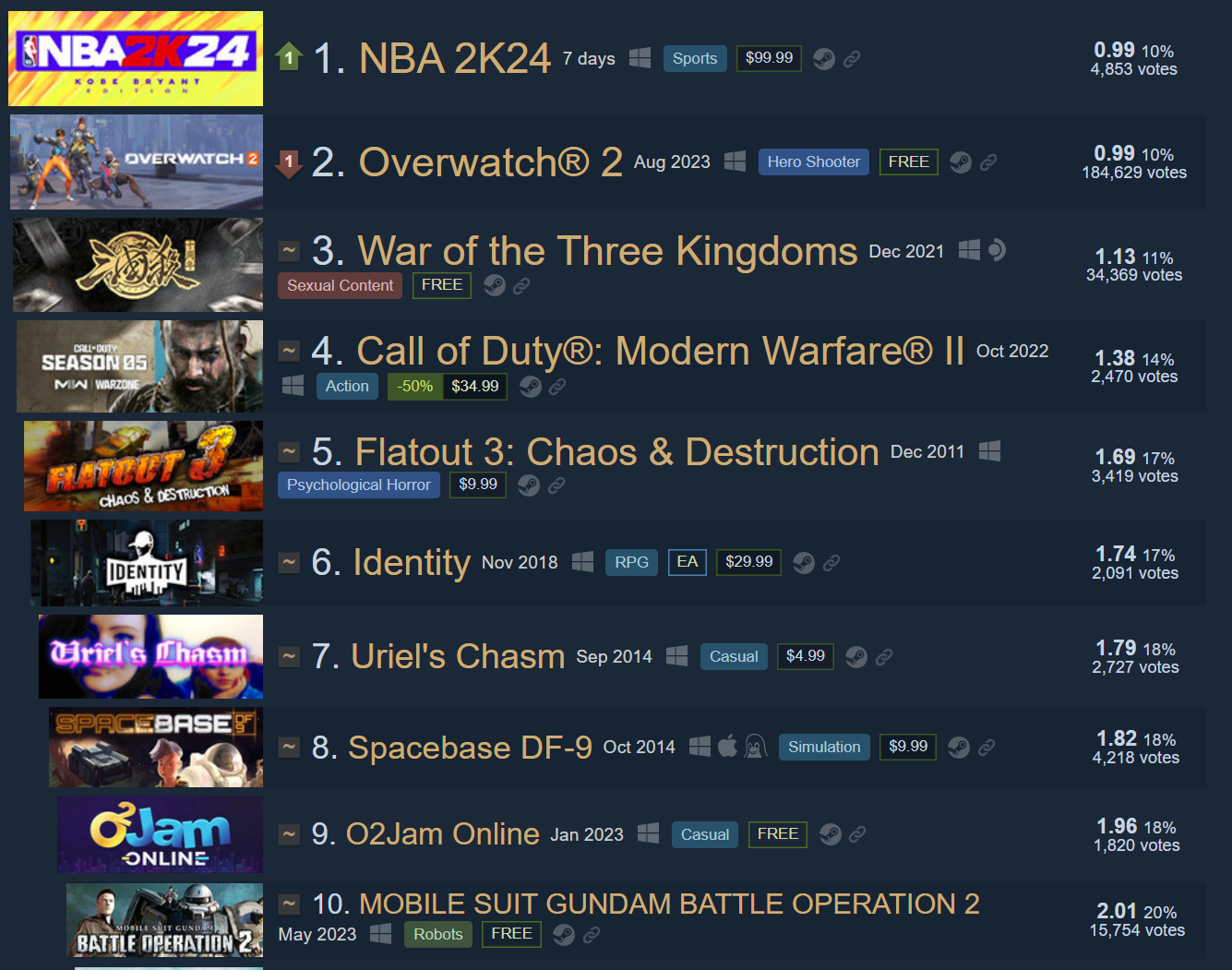 Теперь Overwatch 2 на втором месте, а лидером в негативном рейтинге стала NBA 2k24. Это очередной спортивный релиз 2K (Take-Two), издателя GTA. Игроков достало, что им предлагают версию прошлого поколения даже на мощном ПК с RTX 4090 и они не стесняются в выражениях.