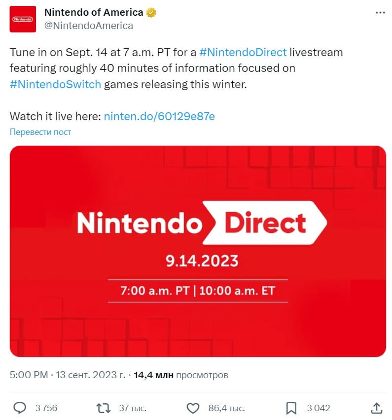 Появилось подтверждение – сегодня, 14 сентября, в 17:00 по московскому времени пройдёт крупная презентация. В течение почти 40 минут представители Nintendo будут рассказывать о новых играх, которые появятся на консоли зимой.